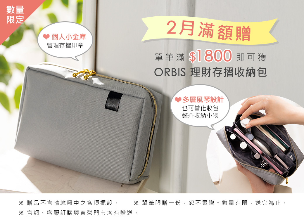 2026/2/1~2/28滿1800元,可獲得「ORBIS 理財存摺收納包」