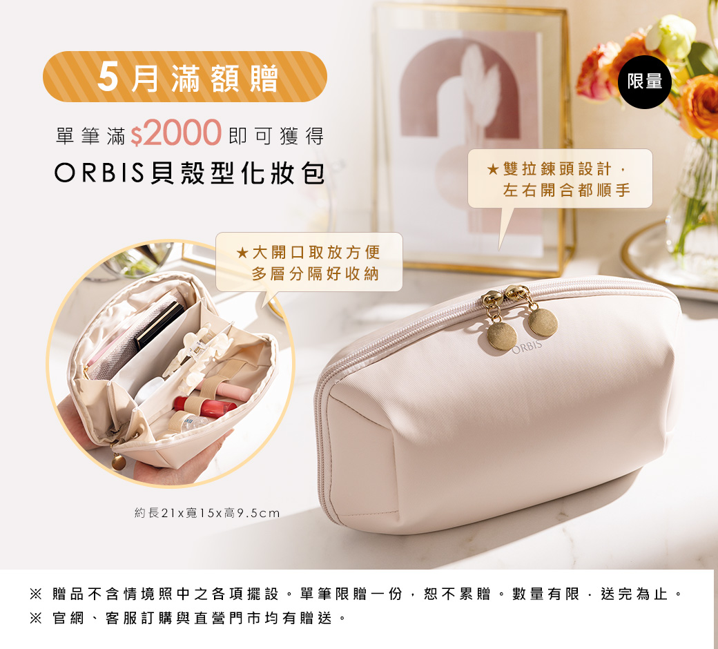 2026/5/1~5/31單筆購滿2000元,可獲得「ORBIS貝殼型化妝包」