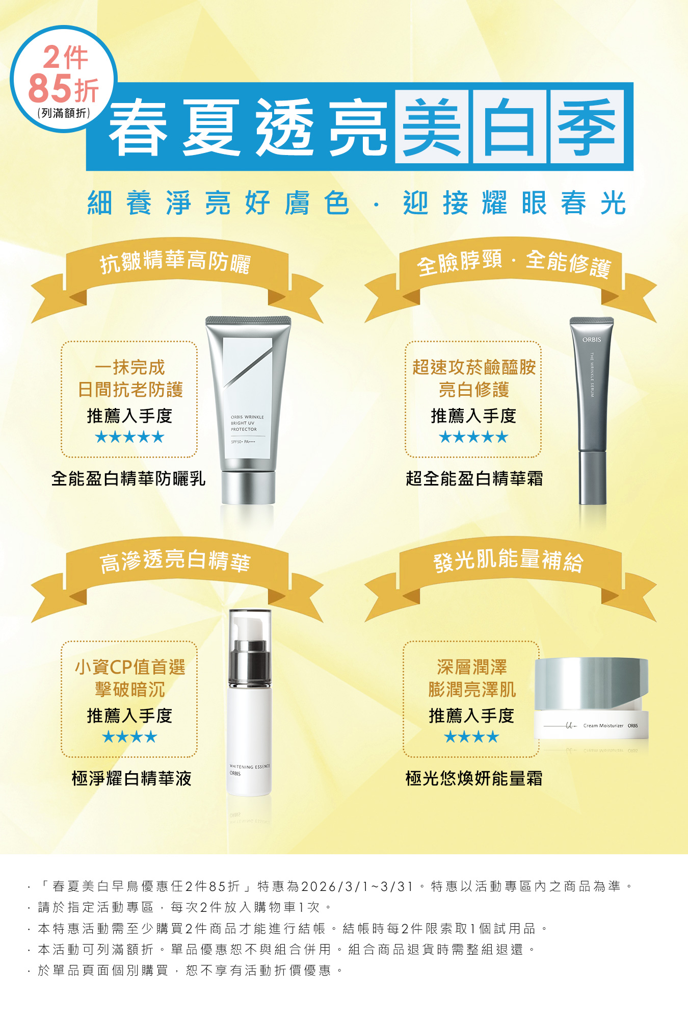 .春夏美白早鳥優惠2件特惠活動日期為2026/3/1~3/31。活動專區內顯示之商品為準。