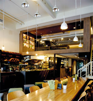 白天時,一樓的座位由於光線十分充足,從店內大大的落地玻璃窗就可以把街道風景看得一清二楚。一樓靠近門口前端有張大長桌,很適合一群好友聚餐喝咖啡。沙發區牆壁上還貼心裝有聚光式閱讀燈,讓喜愛閱讀的人,可以一邊品嘗咖啡,一邊享受閱讀的樂趣。從二樓往下望,可以清楚看到開放式廚房製作餐點的全貌。整齊清潔的餐檯及工作人員忙進忙出的樣子一覽無遺,讓用餐的人感到安心。